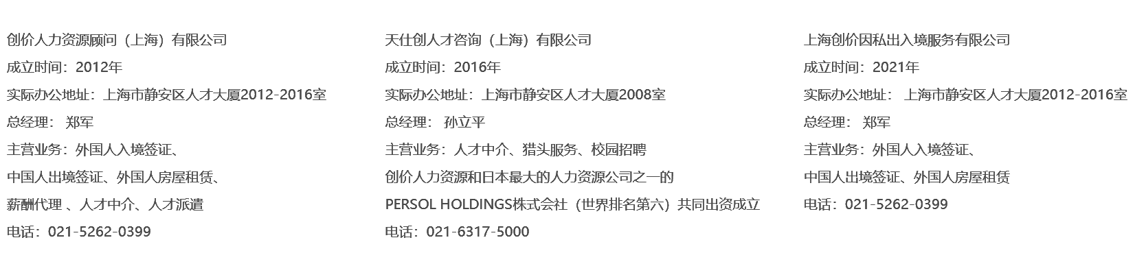 是一家主要经营外国人签证,外国人租赁房屋,中国人出境签证以及薪酬代理,人才派遣的综合性人力资源公司,坐落于上海市静安区梅园路77号人才大厦20楼,为全国各大外资企业以及上海各大高等院校提供上述服务。 创价秉持客户至上,诚信服务的原则开业至今,一直得到客户方的高度赞扬及肯定。不懈致力于人力资源行业发展和服务体系,提高企业竞争力,向广大客户提供更优质的服务。